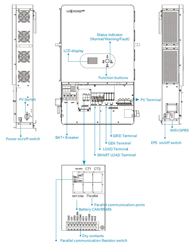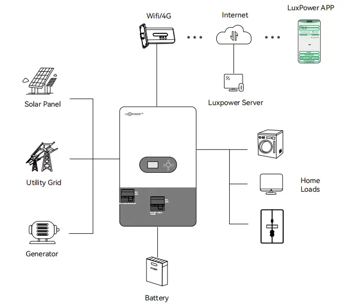 Dets modulære design understøtter parallel forbindelse på op til 16 enheder, hvilket giver forbedret skalerbarhed til at imødekomme forskellige energibehov. Udstyret med en uafhængig belastningsport, der understøtter halvbølgebelastninger, demonstrerer den enestående kapacitet til at håndtere forskellige belastningskrav. Luxpower SNA-EU 12000 har en 100A gennemgående kapacitet og en dedikeret generatorport, der muliggør problemfri integration med eksisterende on-grid-systemer.