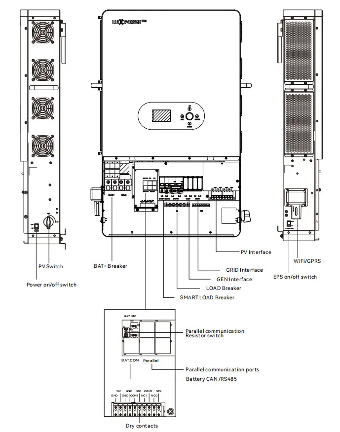 Den Luxpower Sna-US 12000 har dobbelt AC-outputporte til flerbelastningsforbindelse og en robust 100A kontinuerlig gennemgangskapacitet. Dens dedikerede generatorport og problemfri overgang på nettet/off-grid sikrer uafbrudt strømforsyning under krævende forhold.